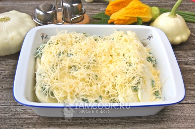 Присыпьте тертым сыром, поставьте в разогретую до 190 градусов духовку на 30-40 минут. Проткните патиссоны вилкой: если они мягкие, блюдо готово, а если жестковаты, оставьте еще минут на 10.