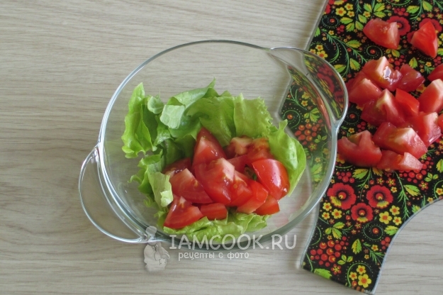 Порвите листья салата и уложите их на дно миски, салатника или блюда. Нарежьте помидоры и разложите их на листовой салат.