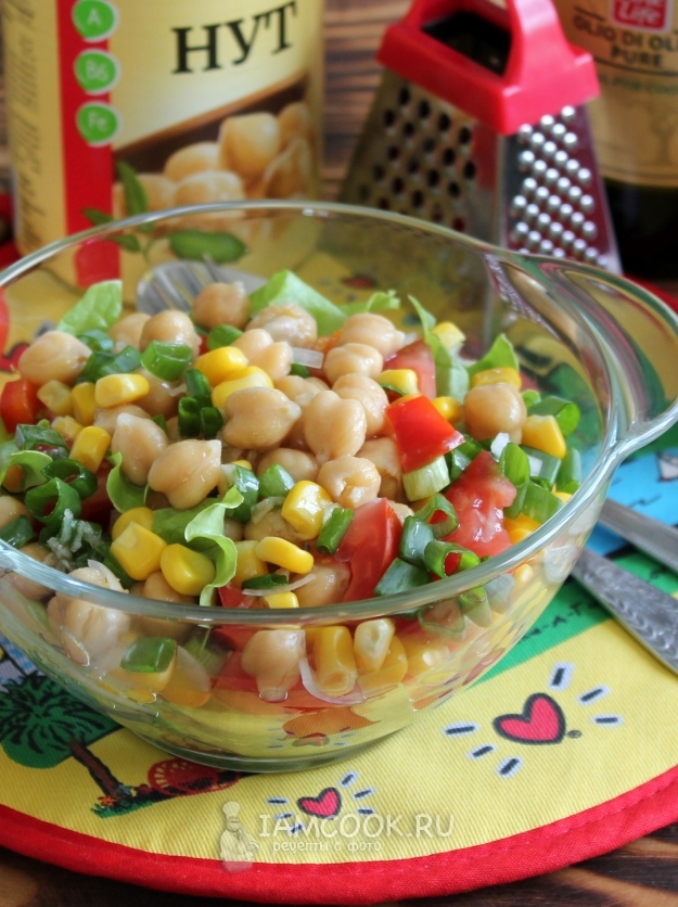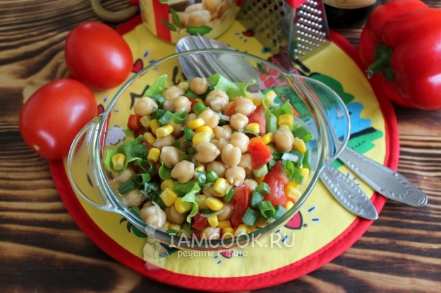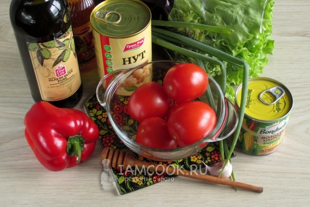 Для салата потребуются готовый консервированный нут, консервированная кукуруза, а также доступные теперь в любом сезоне сладкий красный перец, любые помидоры, лук и свежая зелень, например, перо лука и листовой салат. Помидоры лучше взять небольшие: сливовидные, коктейльные, черри и т.п.