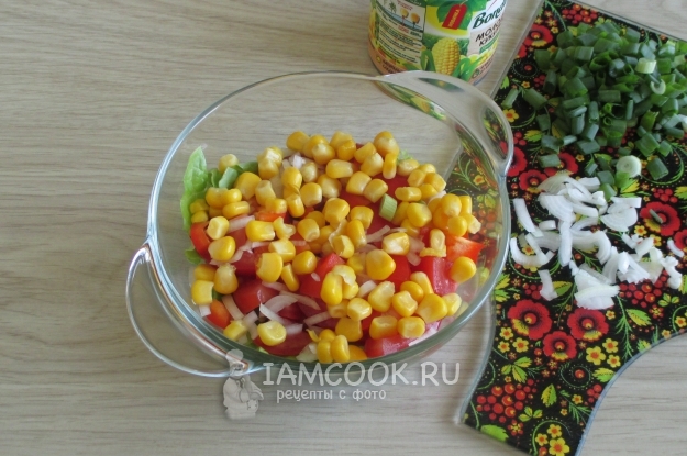 Затем - зерна кукурузы. Тонко нашинкуйте репчатый лук и порубите зелень лука.