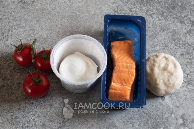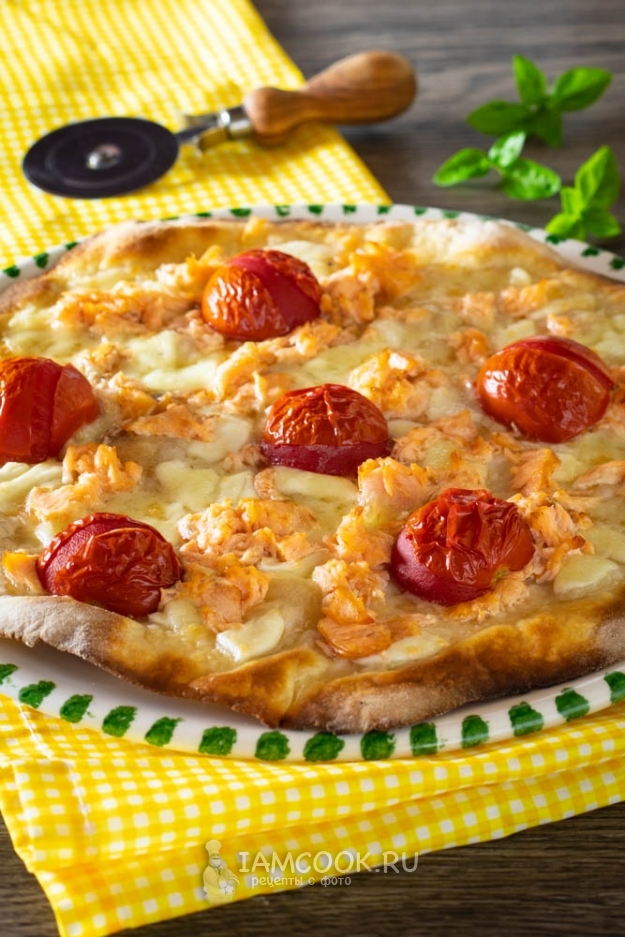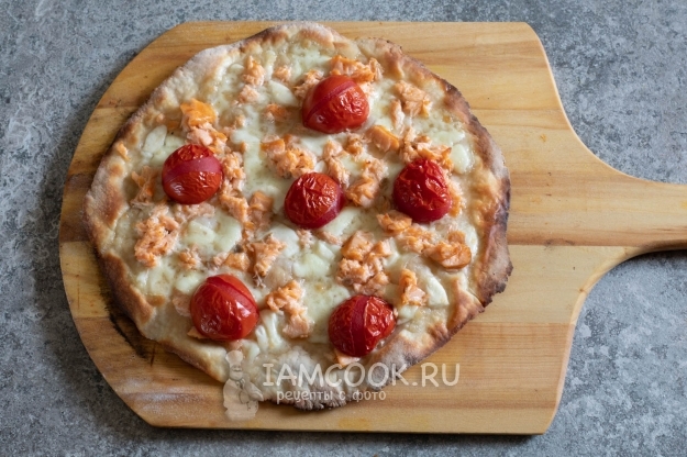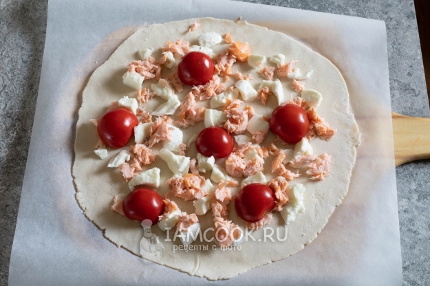Выкладываем на тесто моцареллу, лососину и помидоры.