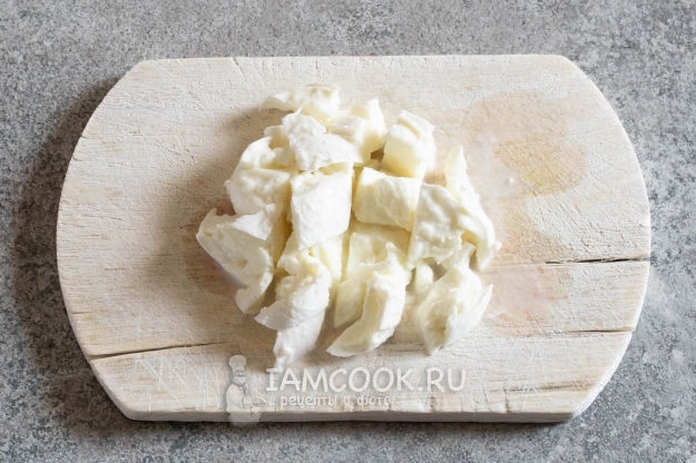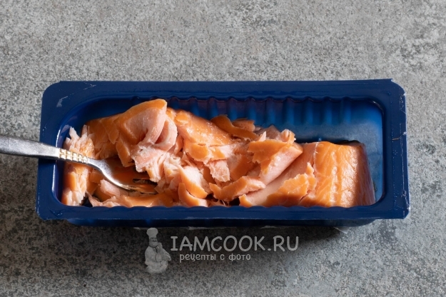 Лососину разминаем вилкой, если позволяет консистенция, и режем на мелкие кусочки, если не позволяет.