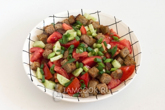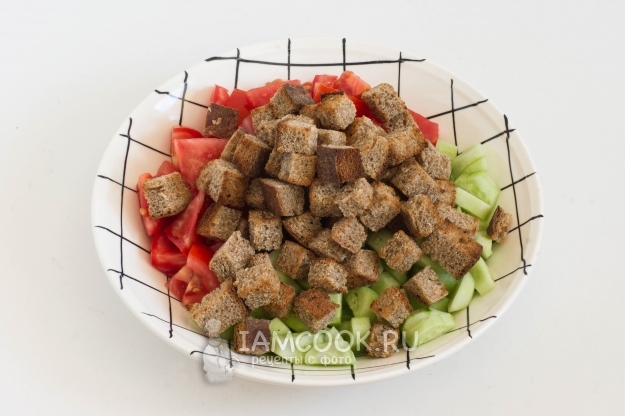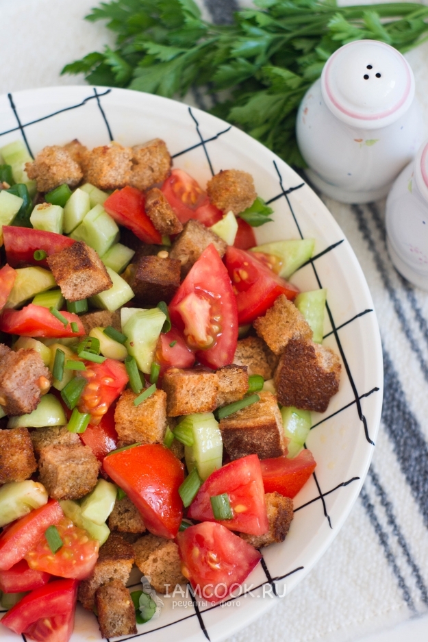 Салат с помидорами, огурцами и сухариками лучше подавать, когда он немного настоится.