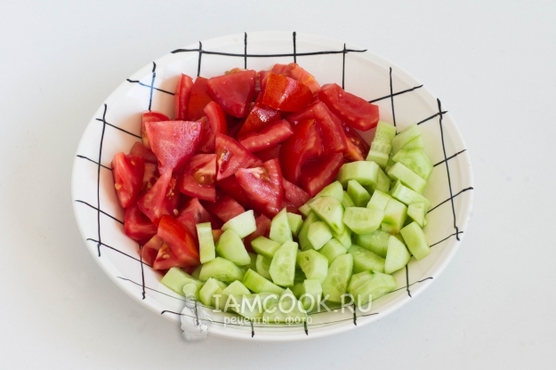 Огурцы и помидоры промойте, нарежьте небольшими ломтиками. Кончики огурцов и основание плодоножки помидоров необходимо удалить.