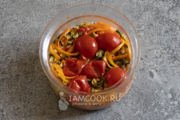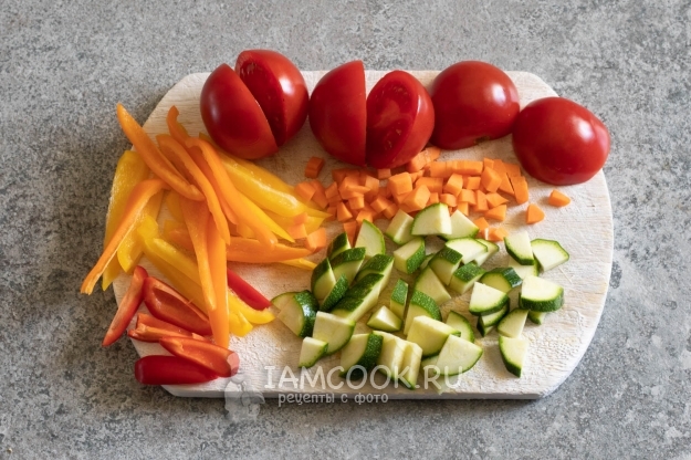 Режем морковь, перцы и кабачок без разницы как, а помидоры - на половинки или на четверти, если это совсем уж большие помидоры.