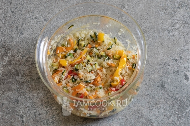 Добавляем рис, промешиваем его с овощами так, чтобы рис покрылся маслом.