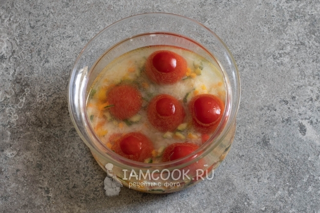 Выкладываем поверх риса помидоры, выливаем соду, слегка солим и готовим под крышкой в микроволновой печи 10 минут на мощности 800 Вт. Естественно, и крышка, и ёмкость должны быть предназначенными для использования в микроволновой печи!
