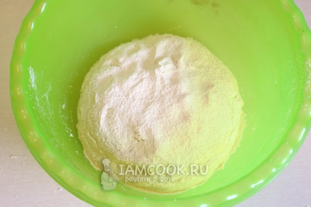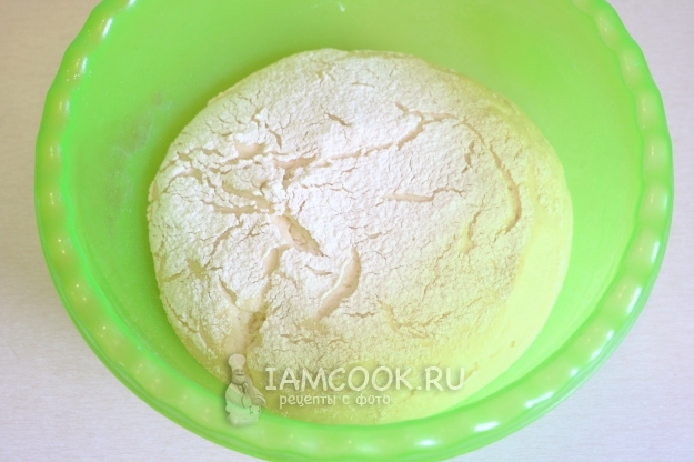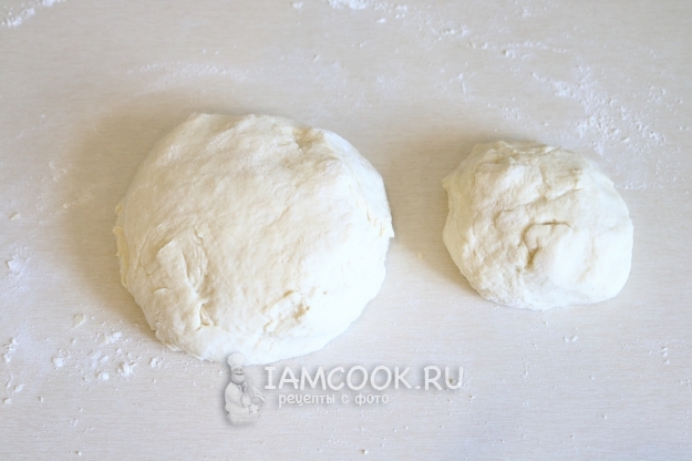 Обминаем его, переложив на стол, присыпанный мукой. Разделяем на 2 неравные части – для верхушки и донышка.