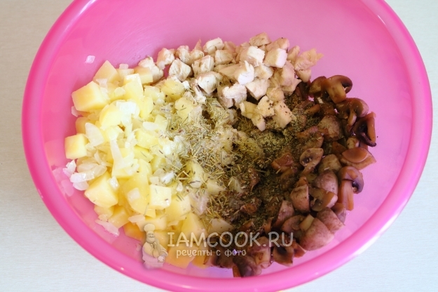 Соединяем компоненты для начинки в одной миске. Солим по вкусу, всыпаем специи: чеснок, базилик, розмарин. Перемешиваем.