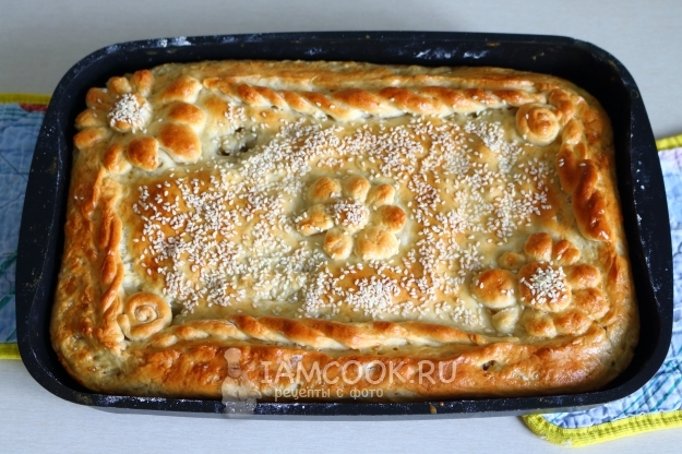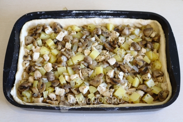 Большую часть раскатываем в прямоугольник и выкладываем в форму, немного смазанную маслом (либо в круг – если форма, соответственно, круглая). Сверху кладём начинку, равномерно распределяя по тесту.