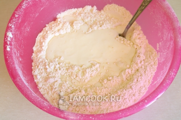 Соединяем мучную и жидкую части, ложкой начинаем замешивать тесто. Как только вся жидкость схватилась с мукой, переходим на замес руками, смочив их растительным маслом. Месим тесто не менее 7-10 минут. Со временем оно станет более эластичным, перестанет рваться.