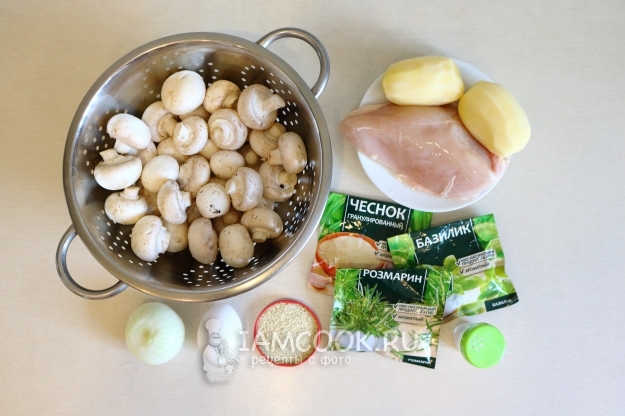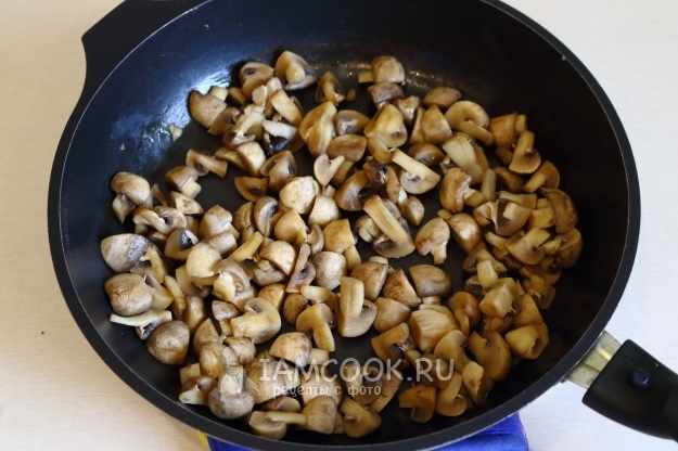 Шампиньоны промойте, если шкурка черная – очистите, нарежьте на четвертинки. Перекладываем грибы на сухую сковороду и тушим до выпаривания собственной жидкости, прикрыв крышкой (около 10 минут).