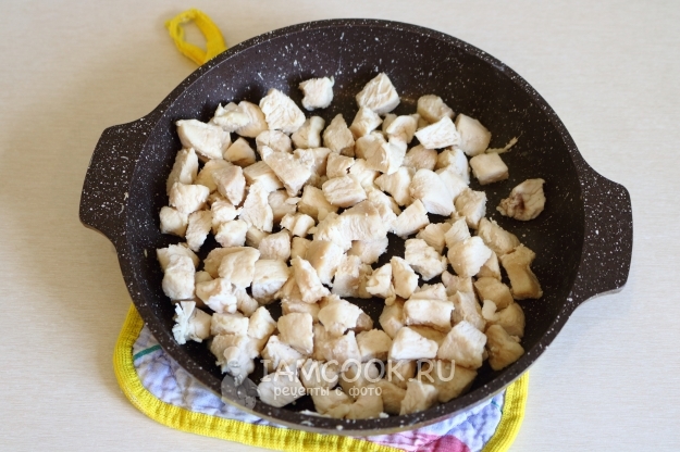 Куриное филе также промываем и нарезаем на маленькие кубики. Тушим в собственном соку до его выпаривания (также около 10 минут).