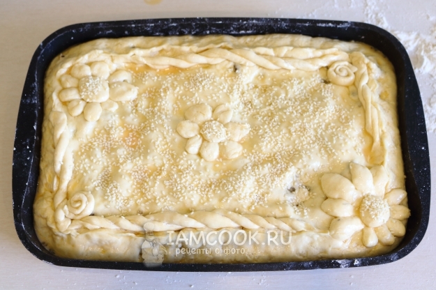 Маленькую часть также раскатываем и выкладываем на начинку, защипывая края. Из остатков теста можно сделать украшения: цветочки и косички. Смазываем пирог взбитым яйцом, посыпаем кунжутом. Настаиваем перед выпечкой ещё минут 20-30. У меня пирог успел расстояться, пока я лепила украшения.