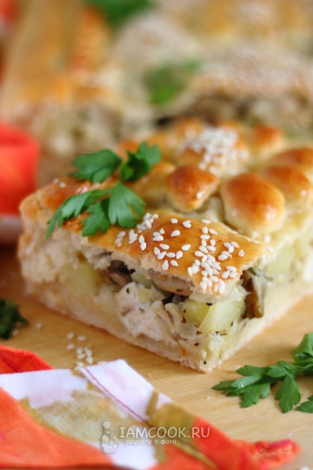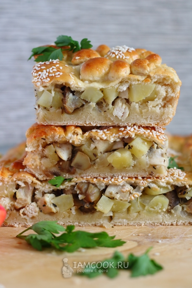 Пирог с курицей, грибами и картошкой готов! Подаём к столу и угощаемся. Приятного аппетита!
