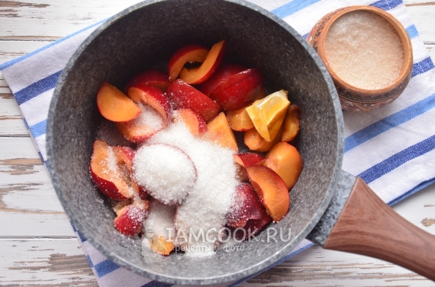 Засыпьте сливы сахаром и добавьте лимонный сок. Теперь влейте 50 мл воды и поставьте сотейник на тихий огонь.