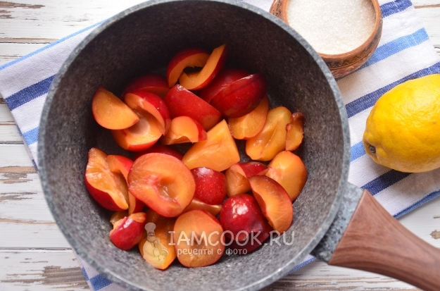 Острым ножом разрежьте сливу на половинки, удалите косточки. Половинки или четвертинки слив отправьте в сотейник.