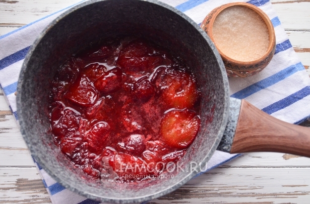 Помешивая, дождитесь, когда сливы с сахаром превратятся в аппетитную и очень ароматную массу. Проварите в общей сложности минут 10.