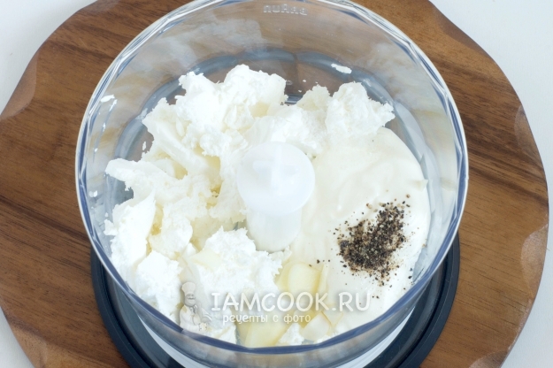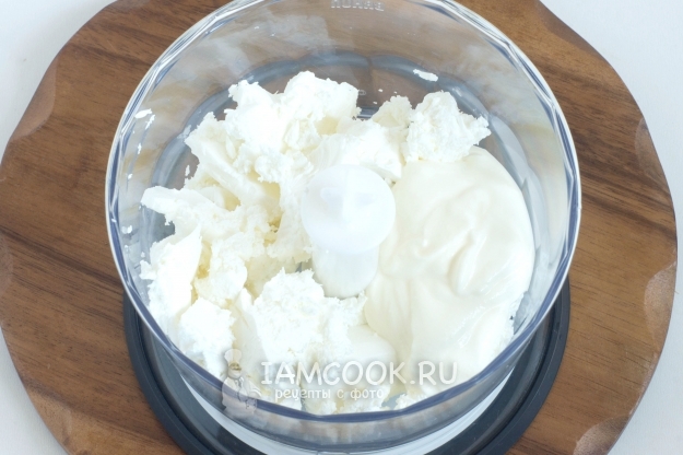 В чаше блендера соедините раскрошенную фету и густой йогурт или сметану.