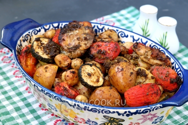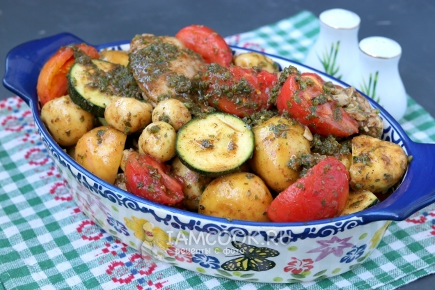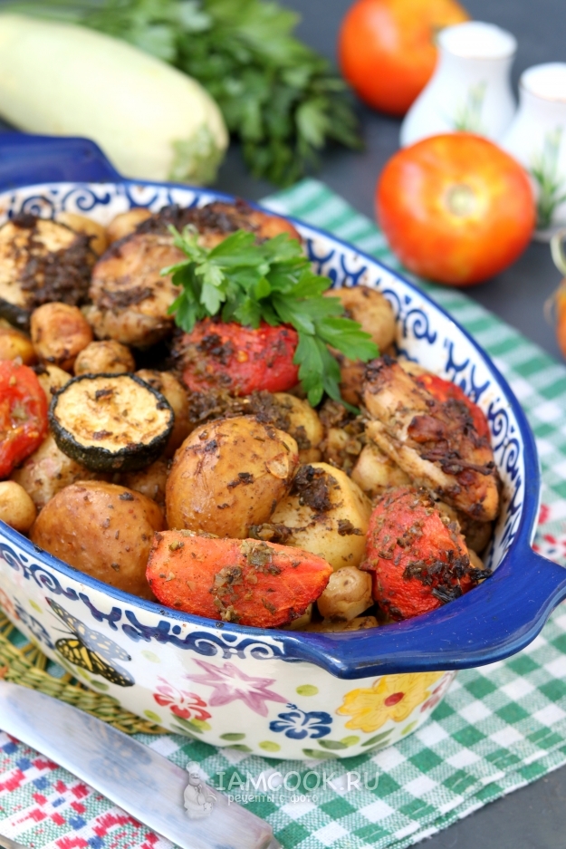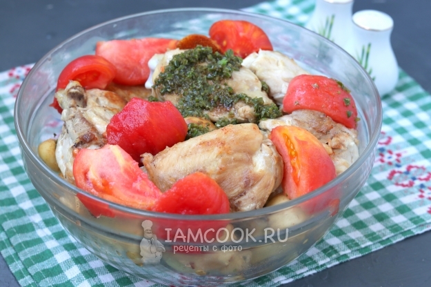 В миску к картофелю добавить кабачки и обжаренные бёдрышки. Помидоры бланшировать, снять шкурку и разрезать помидор на 4 части. В миску добавить помидоры и чесночный соус.