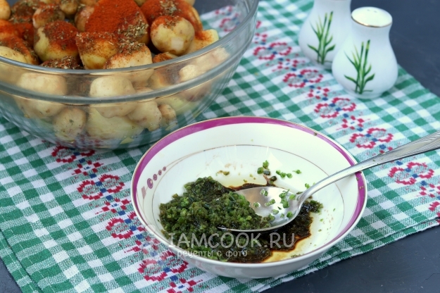 В пиале смешать пасту из чесночных стрелок, одну столовую ложку оливкового масла и бальзамик. Сюда же можно добавить паприку, но я её добавила сразу в картошку.