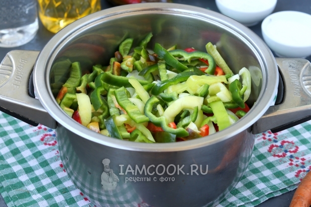 Перец очистить от семян и нарезать полукольцами, добавить в кастрюлю.