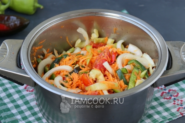 Спустя это время кастрюлю поставить на огонь, довести салат до кипения и варить 20 минут, помешивая.