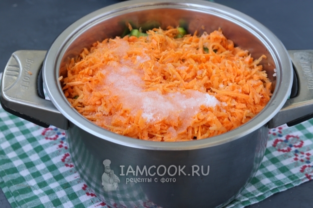 Почистить морковь, натереть её на тёрке и также добавить в кастрюлю.