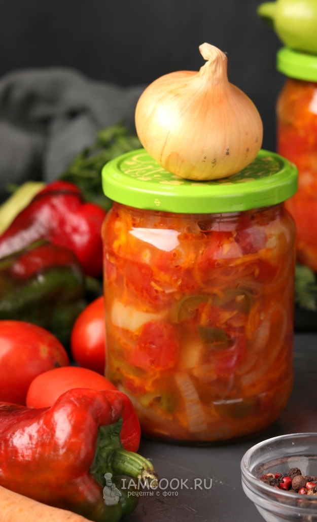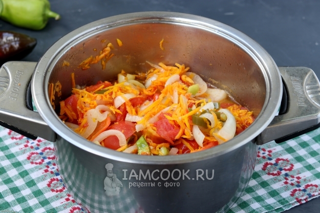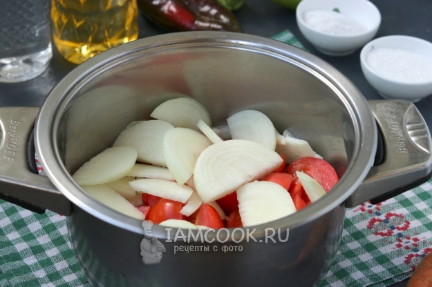 Подготовить кастрюлю, в которой салат можно будет ставить на огонь, желательно взять кастрюлю с толстым дном. Сложить в кастрюлю помидоры, добавить лук, нарезанный полукольцами.