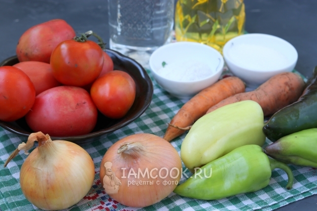 Для приготовления салата из помидоров, моркови и болгарского перца на зиму без стерилизации подготовить из списка необходимые ингредиенты. Указанных овощей хватает на две полулитровые банки, но ещё остаётся тарелочка на пробу. В этом сезоне я произвольно добавила понемногу всех овощей (около 150 г), чтобы хватило на 3 банки и ничего не оставалось лишнего.