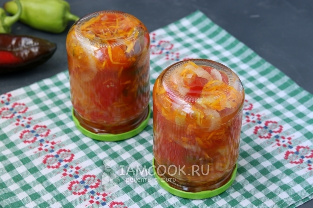 Салат разложить в горячие стерилизованные банки, закрутить прокипячёнными крышками. Банки перевернуть дном вверх, укутать и оставить до полного остывания.