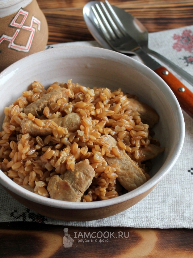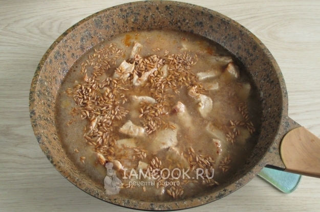 Промойте полбу и отправьте её к мясу, влейте воду.