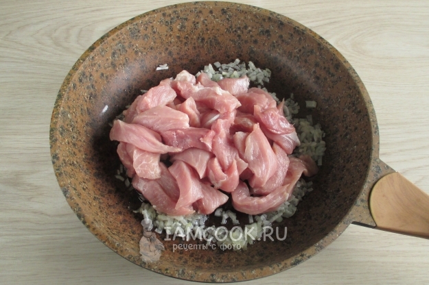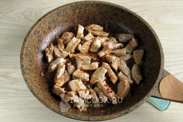 Затем добавьте мякоть свинины, нарезанную примерно как на гуляш - брусочками или кубиками.