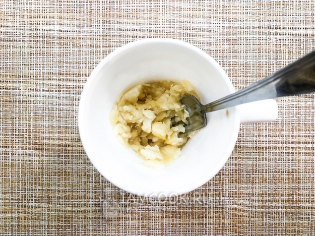 Сложите банан в кружку и измельчите его вилкой в пюре.