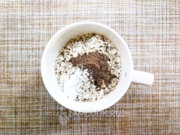 Добавьте овсяные хлопья, разрыхлитель и корицу.