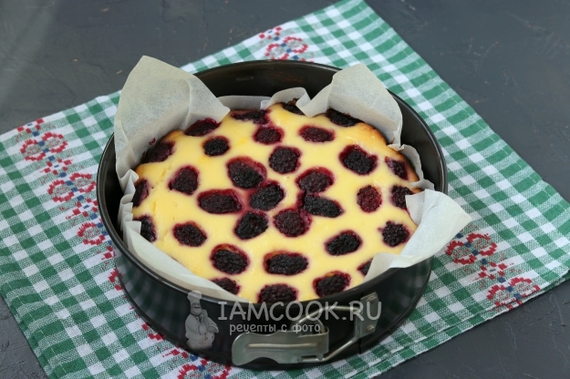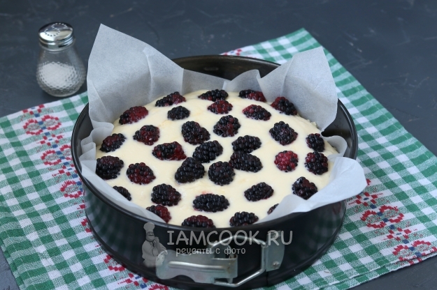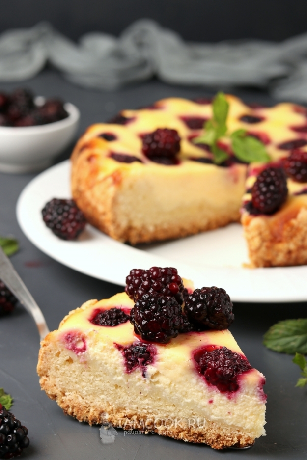 Вылить сверху творожную начинку и разложить сверху ягоды ежевики.