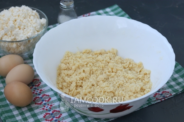 Всю массу перетереть в крошку и убрать в холодильник, пока будем готовить творожную начинку.