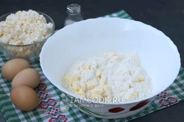 Просеять в миску муку с разрыхлителем, добавить сахар, ванильный сахар и соль. Кубиками нарезать холодное сливочное масло.