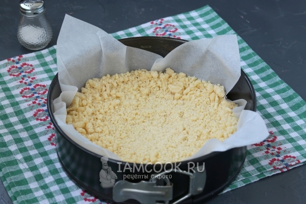 Форму диаметром 22-24 см застелить пергаментом. Достать из холодильника крошку и ещё раз её перетереть. Засыпать крошку в форму, разровнять и сделать углубление, чтобы начинка не растекалась за пределы крошки.