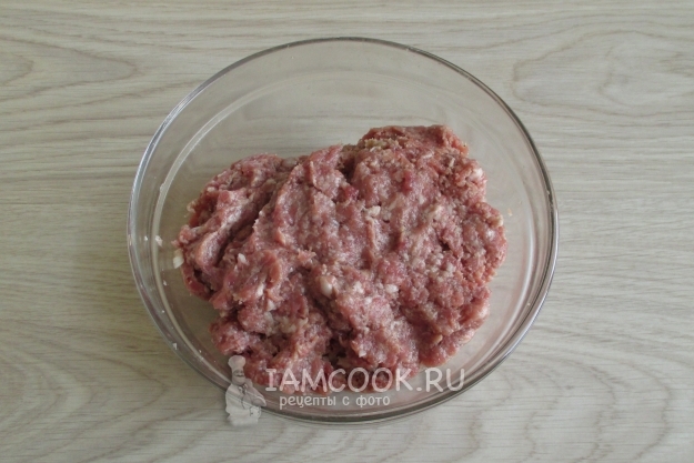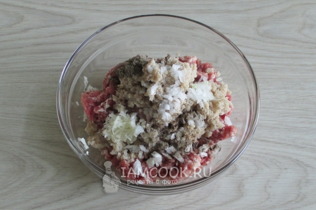 Мясной фарш из говядины и свинины соедините с размоченным хлебом, мелко рубленным репчатым луком и измельченным чесноком, добавьте соль, перец.