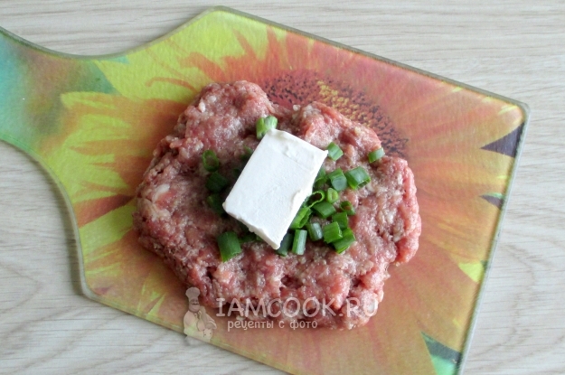 Разделите фарш на четыре части. Сыр Брынза нарежьте подходящими по размеру ломтями или брусками. Зеленый лук нашинкуйте. Сформируйте из фарша лепешку, уложите на неё порцию лука и кусок брынзы.