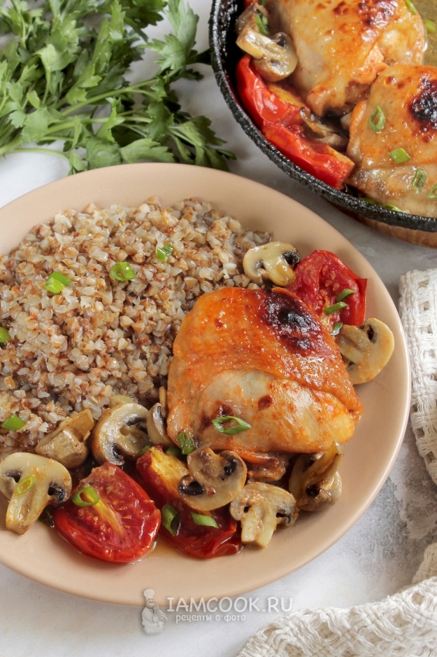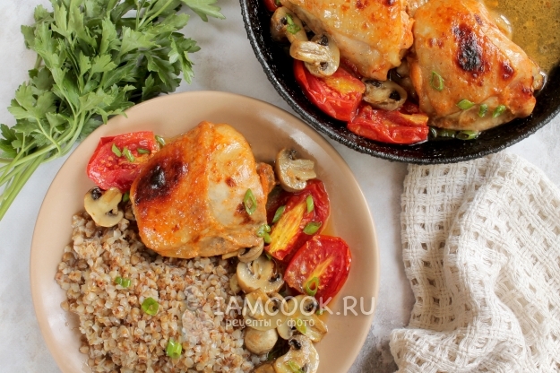 На стол куриные бедра с грибами и помидорами подаем горячими, по желанию — с гарниром.