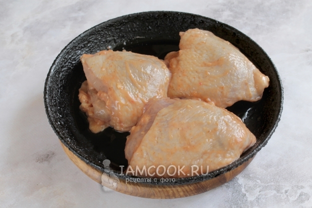 К чистым куриным бедрам добавляем томатный соус, сметану, мед, измельченный чеснок, соль и молотый острый перец.
