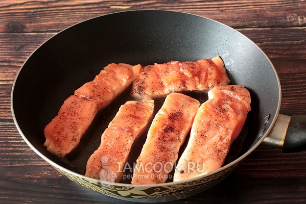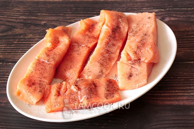 У меня было филе лосося на коже. Рыбу очистить от чешуи или снять кожицу, как сделала я. Посолить и поперчить с двух сторон.