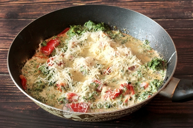 Влить сливки. Посолить и поперчить, учитывая, что пармезан тоже содержит соль.