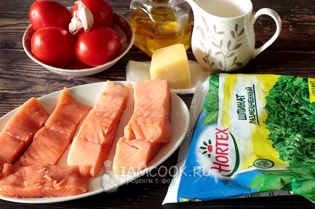 Чтобы приготовить филе лосося в томатно-шпинатном соусе, возьмите необходимые продукты. Все готовится предельно просто.
