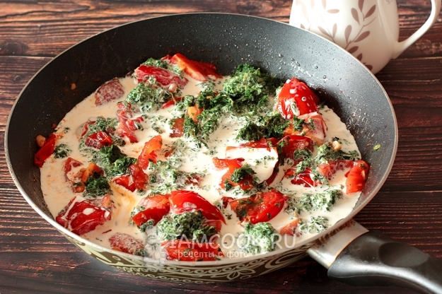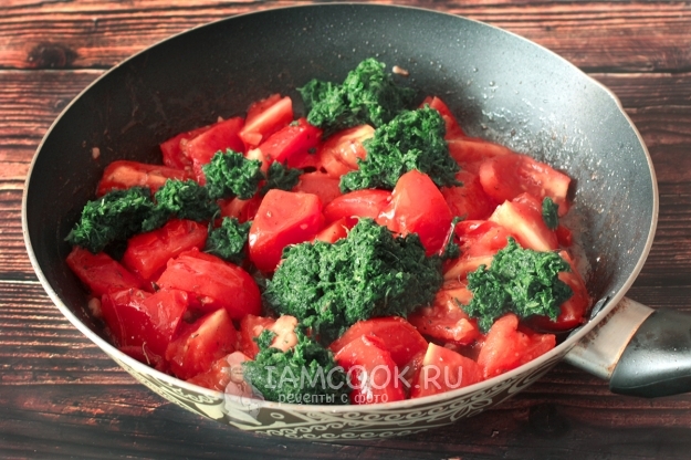 Добавить к томатам размороженный и отжатый от воды шпинат. Обжаривать все вместе еще 2 минуты.