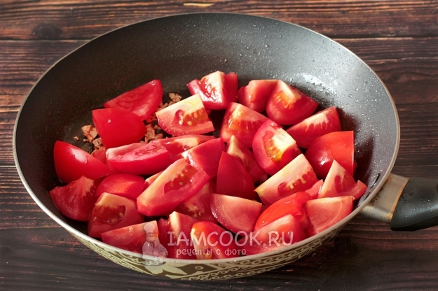 В оставшемся масле быстро обжарить чеснок. Сразу же добавить томаты. Лучше всего использовать черри помидорки, разрезанные пополам, но продолговатые сливки тоже годятся. Их нужно разрезать на 4 части. Помидоры обжаривать, помешивая, 3 минуты.