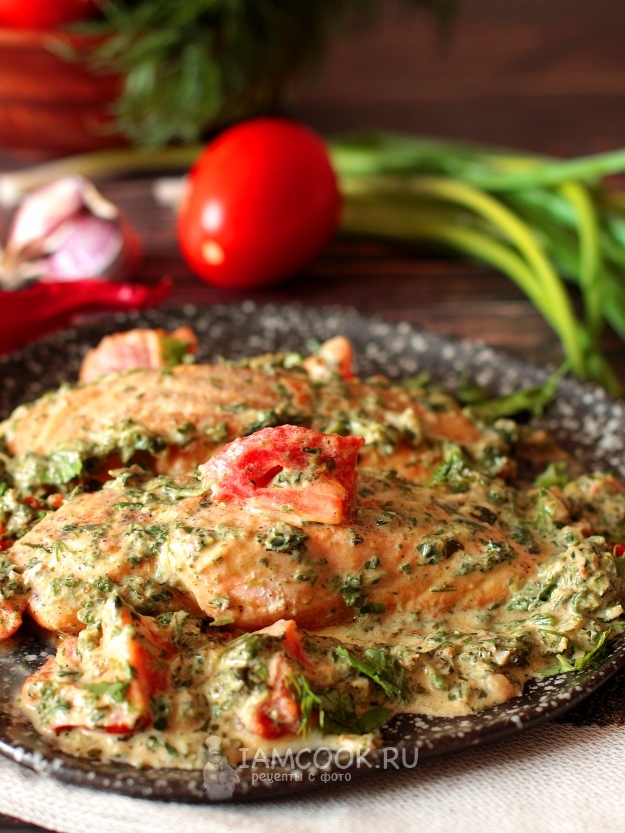 Филе лосося в томатно-шпинатном соусе готово. Посыпьте его свежей зеленью. Приятного аппетита!