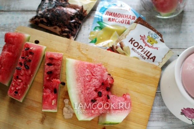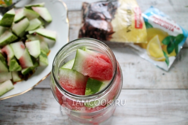 Арбуз порежьте дольками вместе с корочкой. Корочку можно снять, но с нею удобнее и привычнее - словно настоящий арбуз зимой! Просто обрежьте ее по краю как можно больше, чтобы место не занимала, хотя она тоже очень вкусной получается. Уберите семечки.